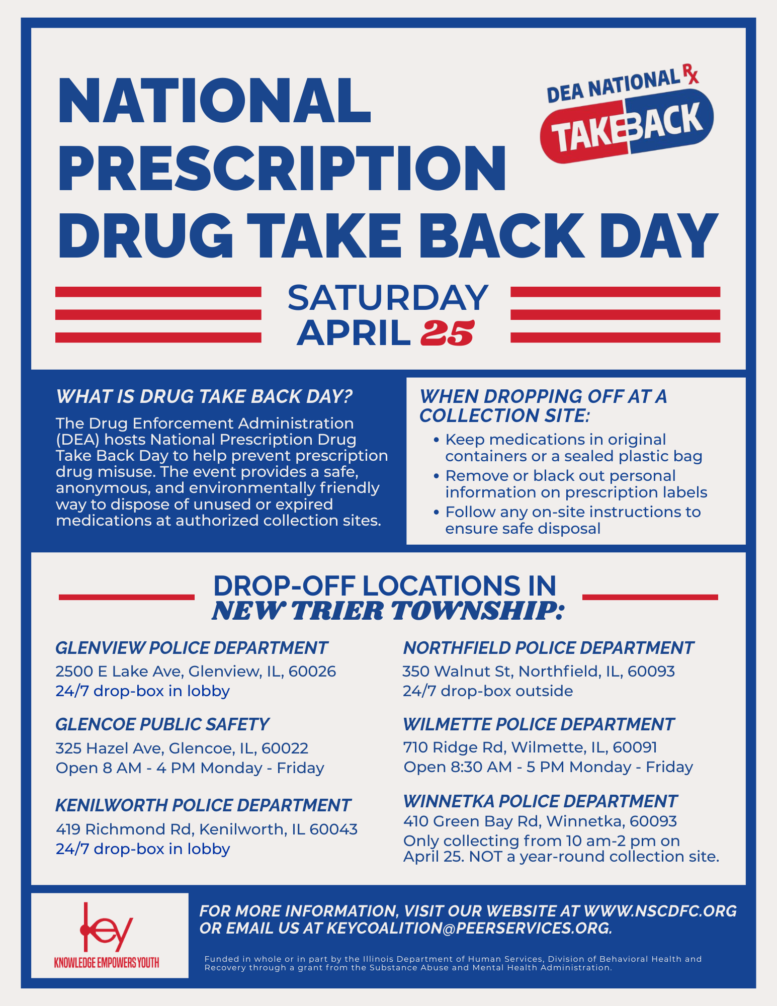 Participate in Drug Take Back Day, a nationwide initiative to safely collect unused or expired medications. Bring your prescription and over-the-counter drugs to a designated drop-off site with no questions asked. Prevent medication misuse and protect your family, friends, and the environment! All drop-off sites within New Trier Township are listed below.
